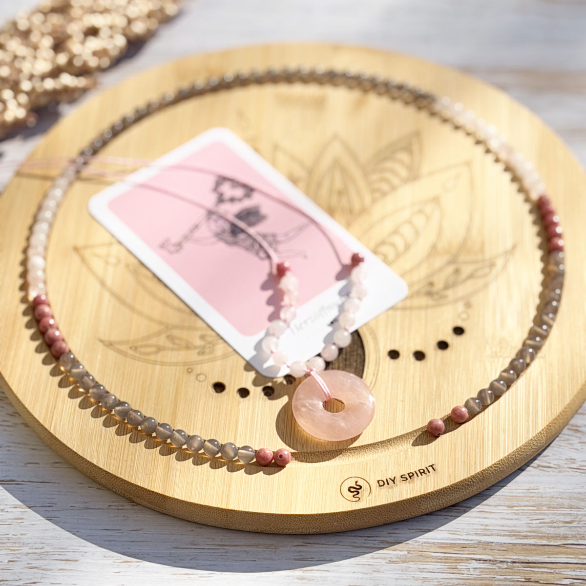 Erschaffe mit unserem DIY-Material deine eigene tantrische Kette. Mit zarten Perlen aus hochwertigen Edelsteinen und unserem einzigartigen Tantric Necklace Fädelboard.