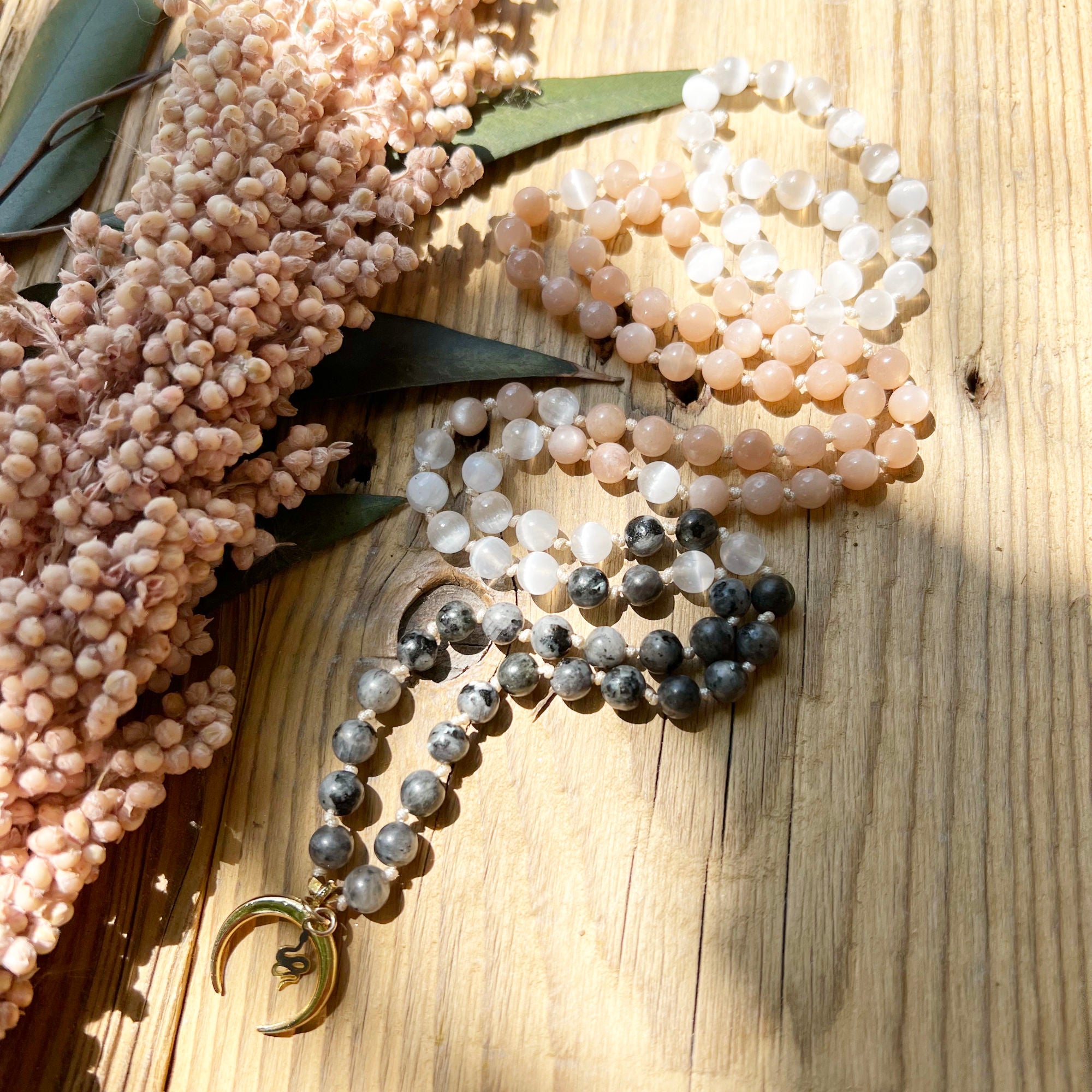 Vollmond-Kristalle (Mondstein, Selenit, Labradorit), Kraftsteine (Jaspis, Heliotrop, Karneol, Tigerauge) und Palo Santo