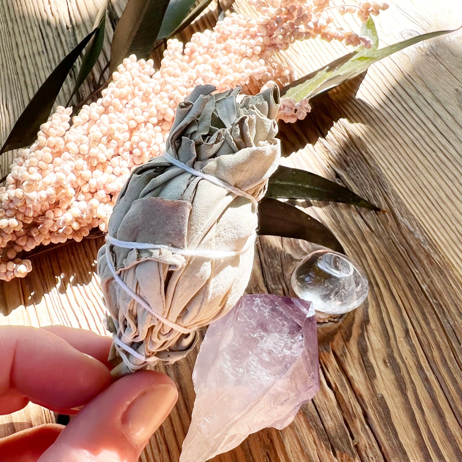 In unserem Aura Cleanse Ritual-Set haben wir eine Räucherfackel aus weißem Salbei zum Räuchern deiner Räume, eine Amethyst-Spitze zum Ausstreichen deiner Aura und einen Bergkristall zum Aufladen und Klären deiner Energien zusammengestellt.