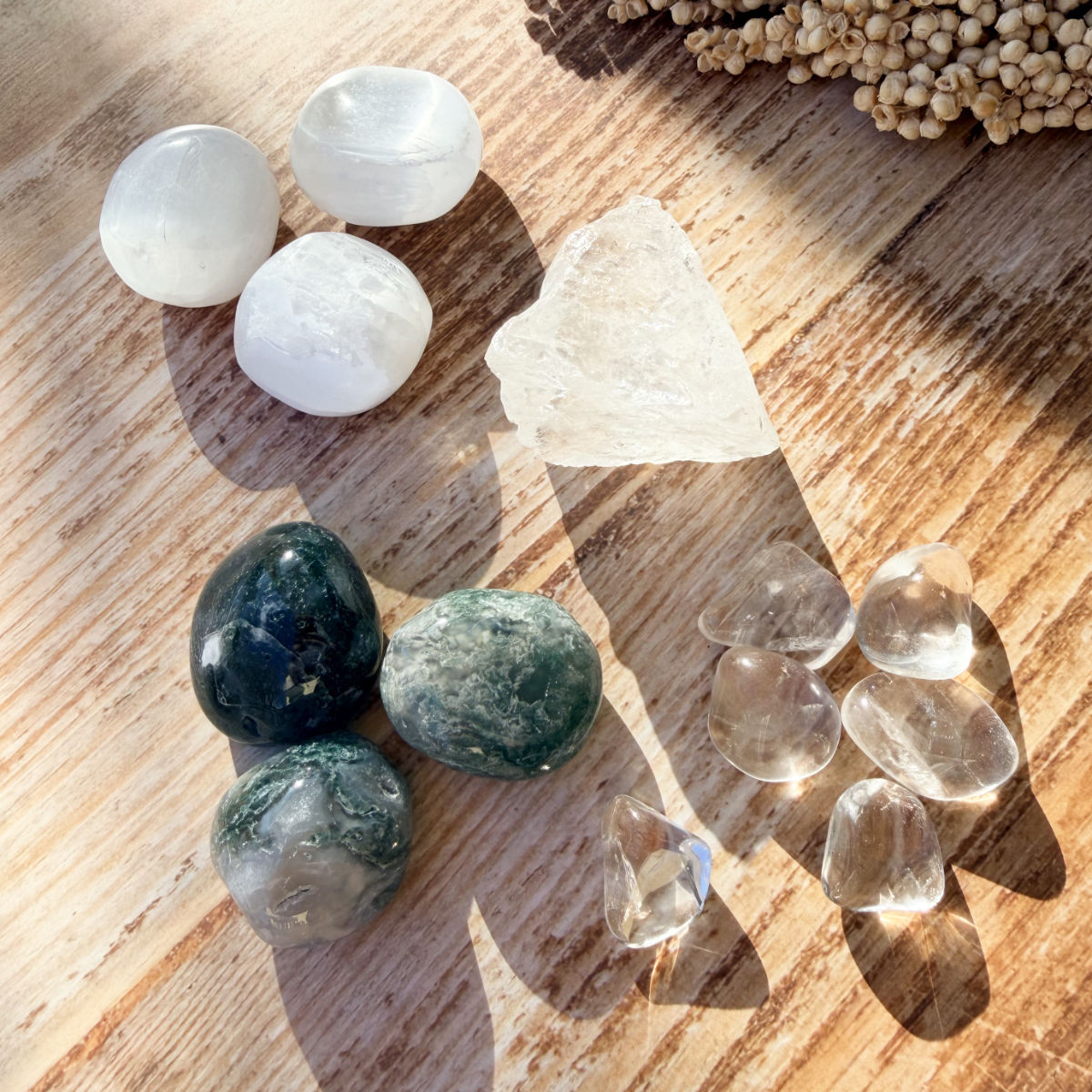 - Enthält: 3× Moosachat · 3× Selenit · 6× Bergkristall Trommelsteine