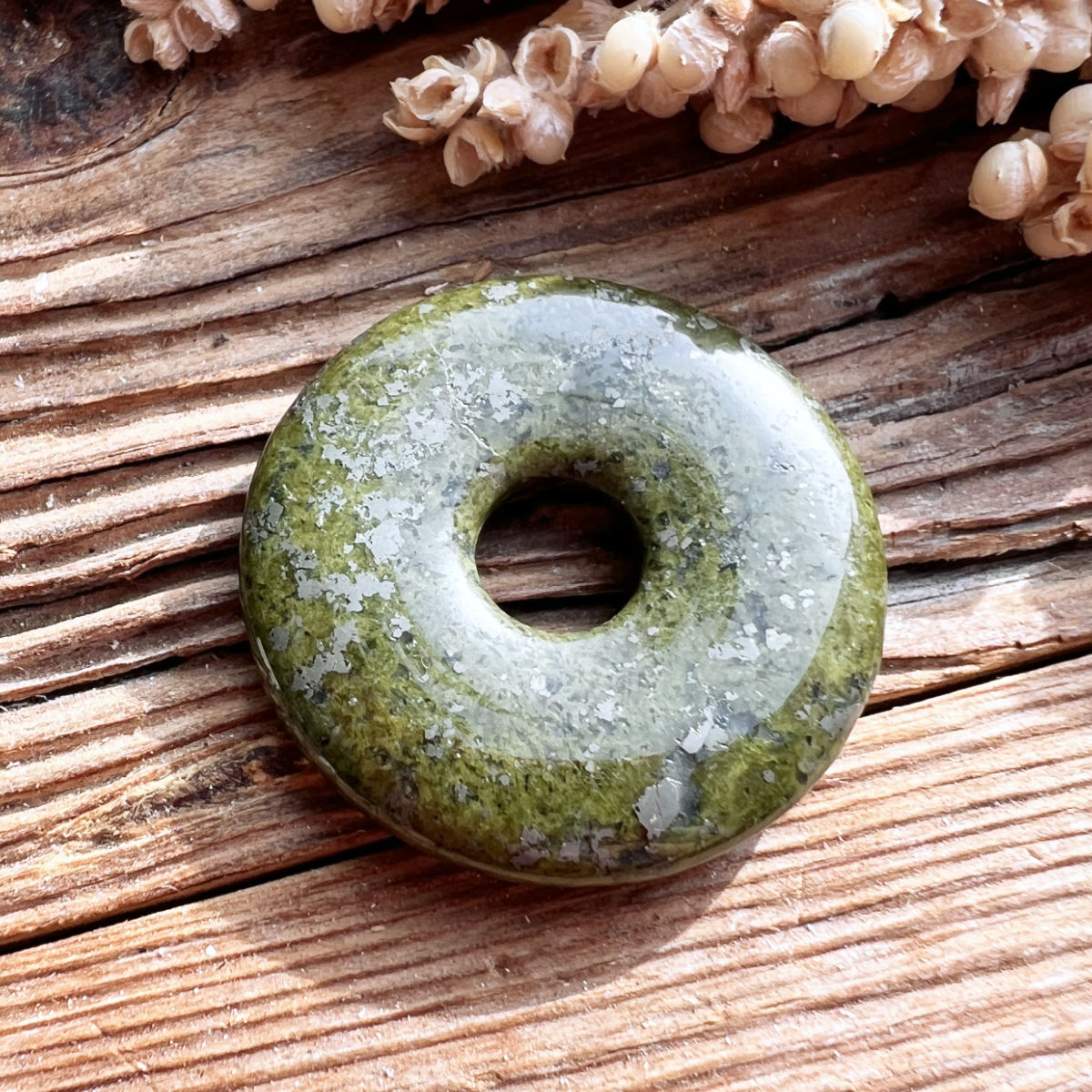 Trage den Epidot Donut im Alltag für Stabilität und Mut oder nutze ihn in deiner Mala, um Wachstum und Heilung in deine spirituelle Praxis einzuladen.