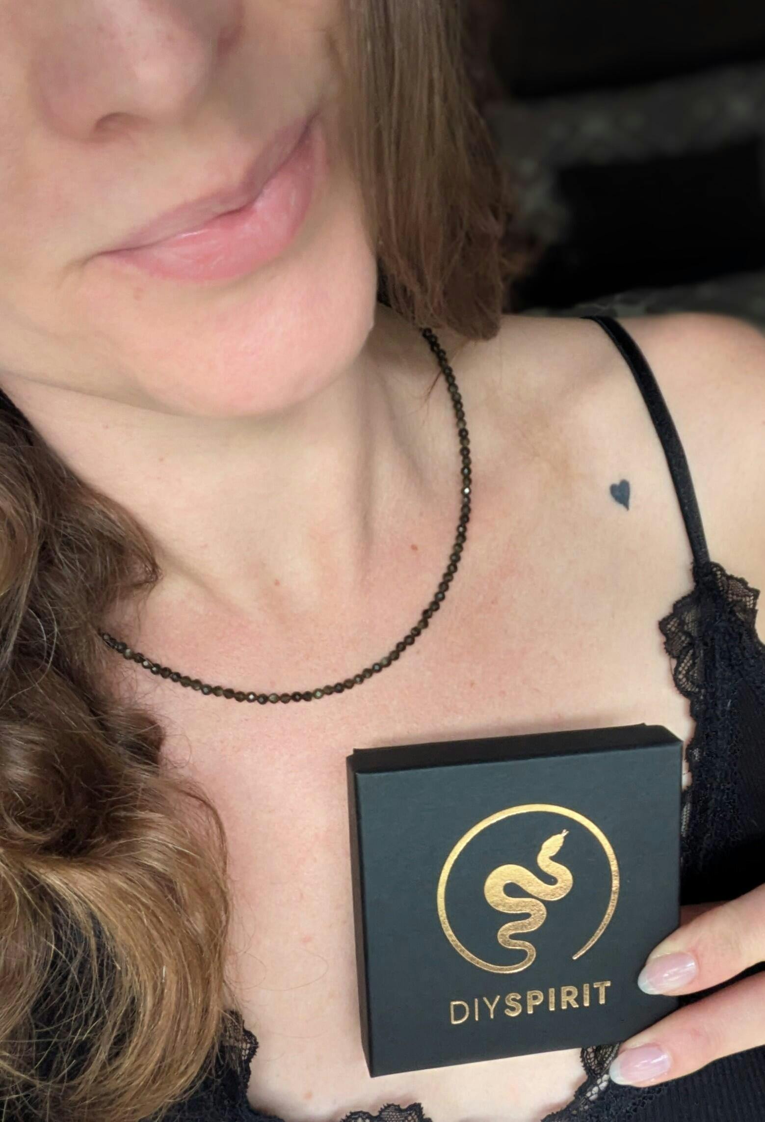Die Kette besteht aus facettierten Obsidian-Perlen mit einem Durchmesser von etwa 3 mm auf einem Schmuckdraht mit einem Metallverschluss aus 925 Sterling Silber im Nacken. Die Kette hat eine Gesamtlänge von etwa 45 cm.