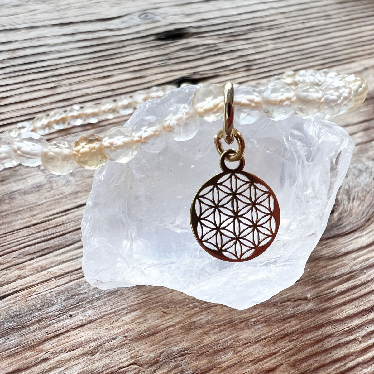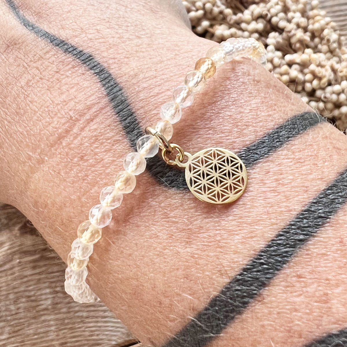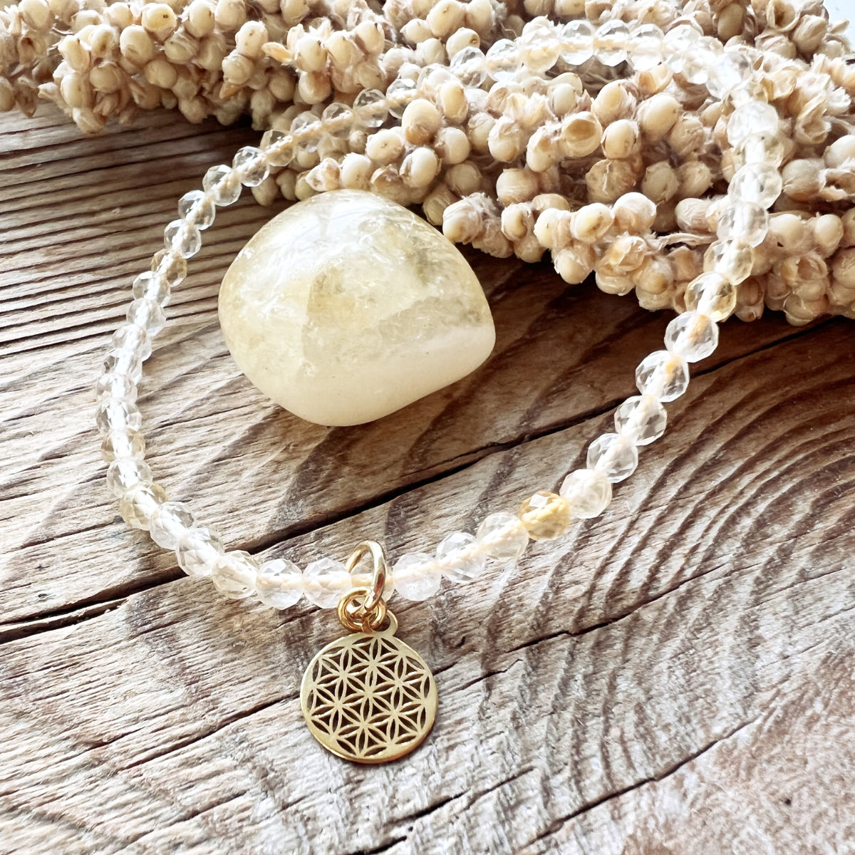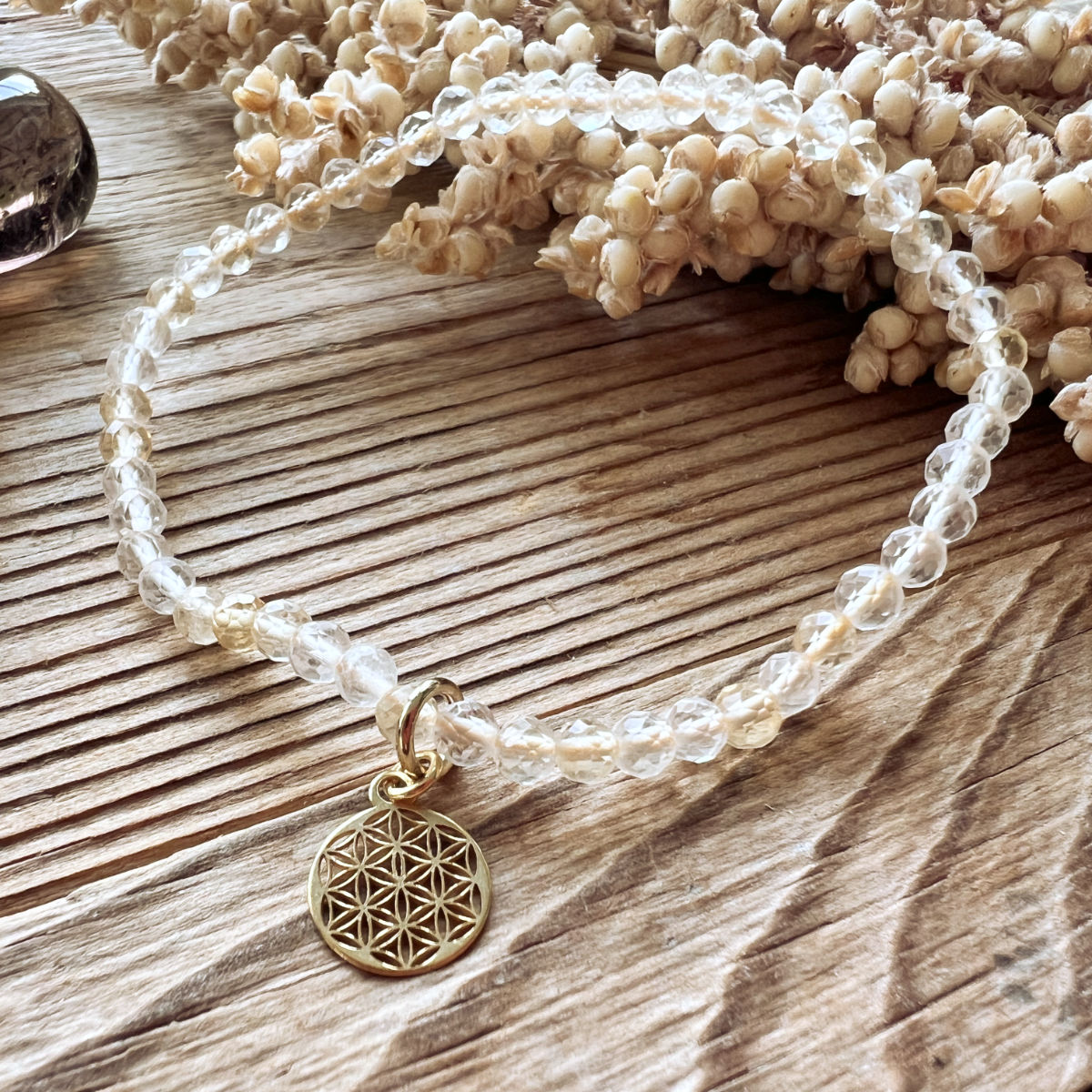 Gefertigt aus echten Citrinperlen und einem filigranen Anhänger mit der Blume des Lebens, erinnert es dich daran, dein inneres Licht zu nähren, in deinem Vertrauen zu ruhen und voller Leichtigkeit deinen Weg zu gehen.