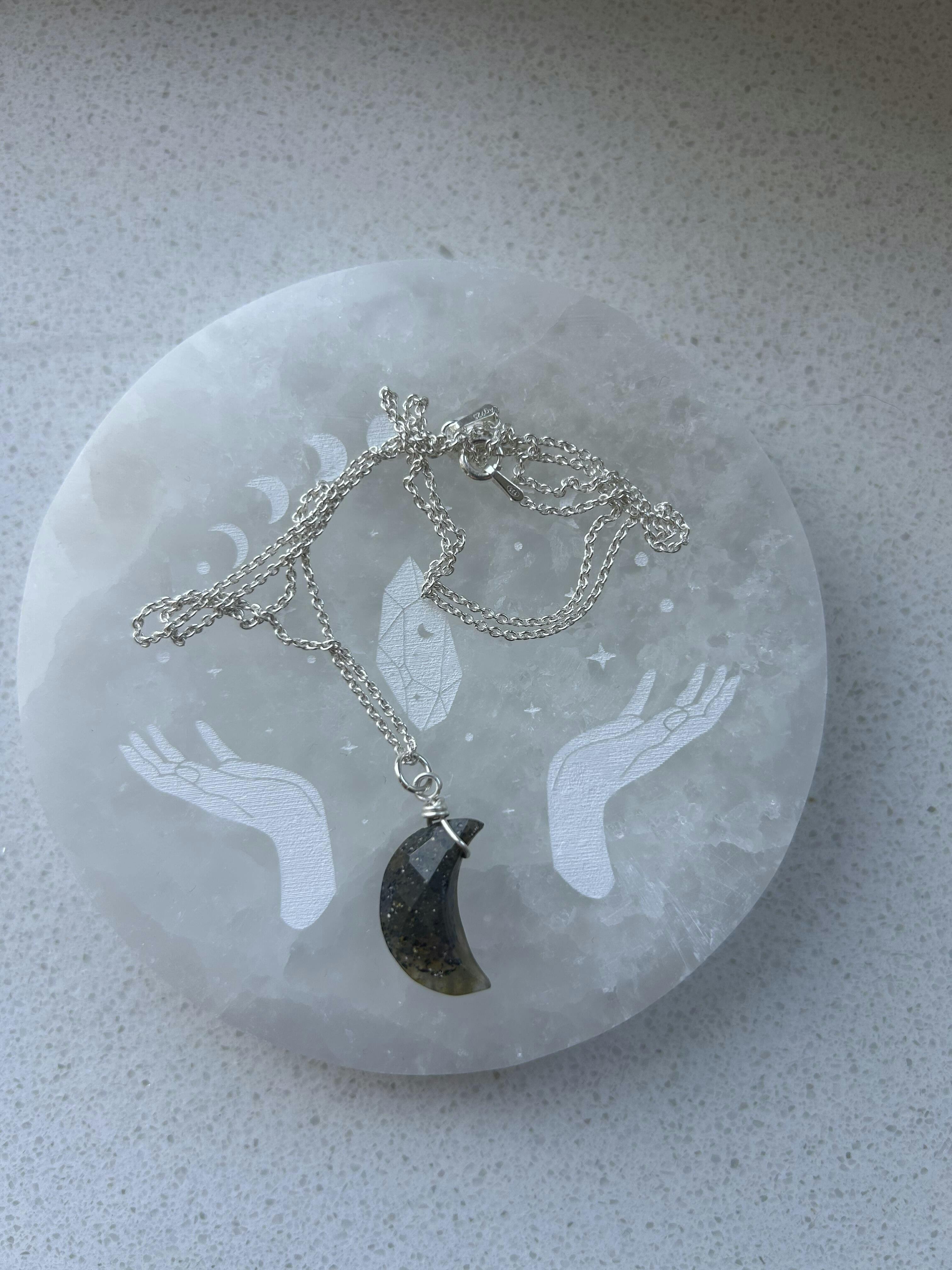 Tauche ein in die sanfte und weibliche Energie des Mondes gepaart mit kraftvollen Heilsteinen an unseren zarten Halsketten.