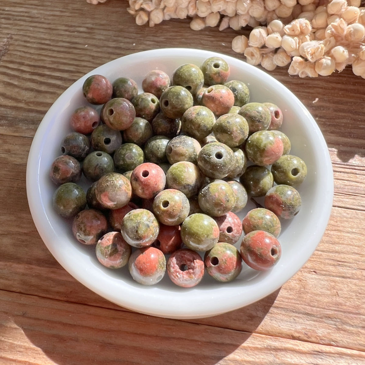 Hochwertige Perlen aus Unakit – perfekt für DIY Schmuck, Armbänder und das Knüpfen deiner eigenen Mala-Kette.