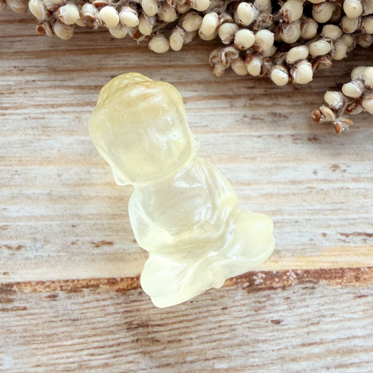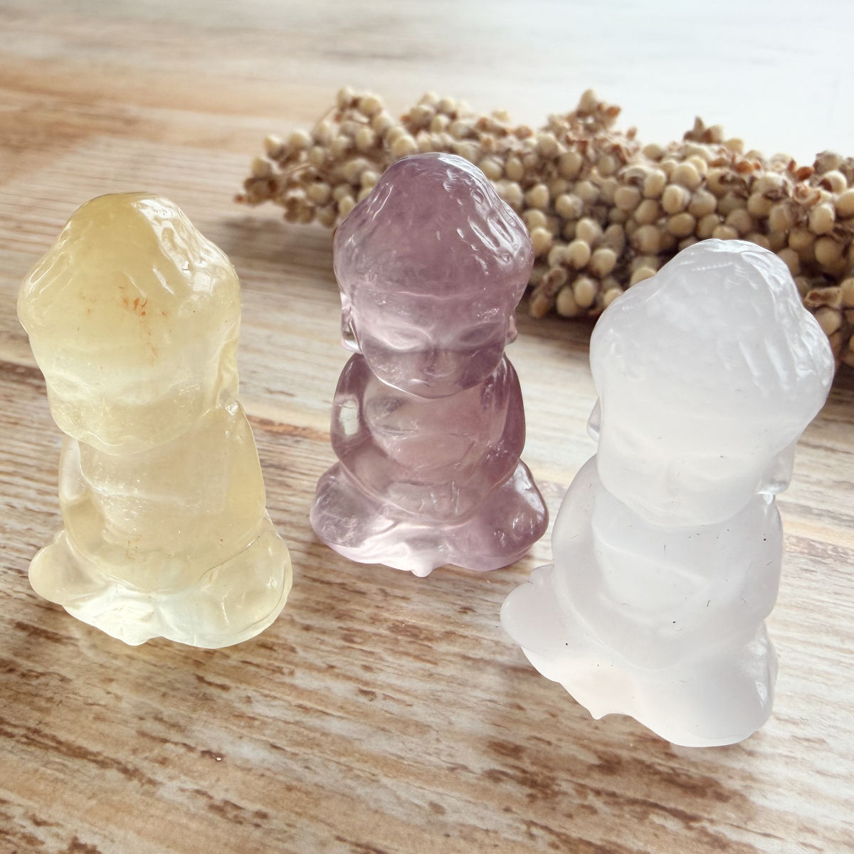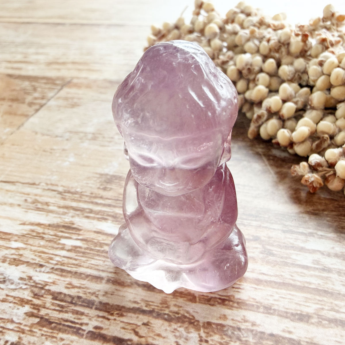 Diese fein gearbeitete Edelsteingravur eines kleinen Buddhas aus Fluorit erinnert an Reinheit, Leichtigkeit und das innere Erwachen.