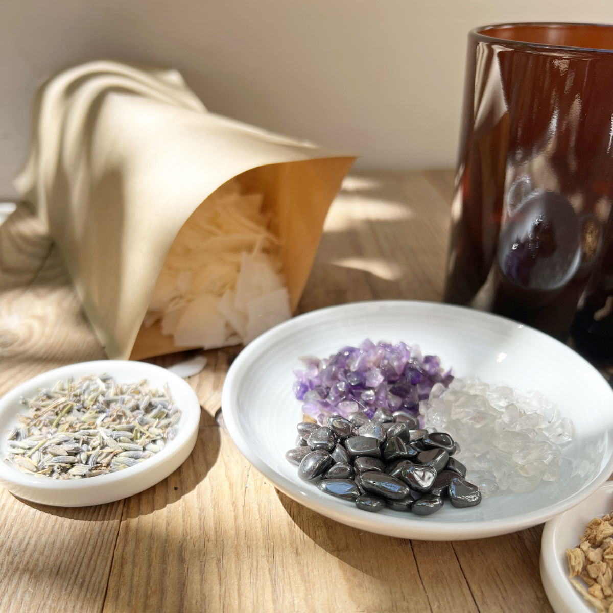 Unsere liebevoll zusammengestellten DIY-Sets enthalten alles, was du brauchst, um deine eigenen, einzigartigen Kristallkerzen zu kreieren. Wähle Glas, Steine, Duft und Dekoration und fertige deine individuelle Crystal Candle.