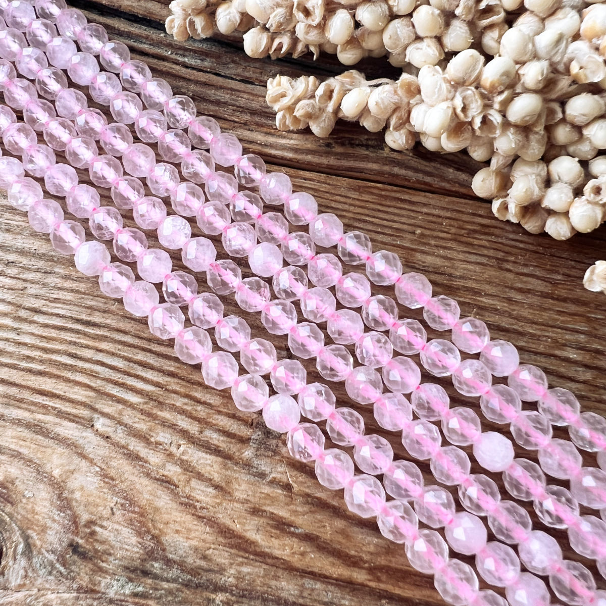 Hochwertige, facettierte Rosenquarz-Perlen – perfekt für DIY Schmuck, Armbänder und das Knüpfen deiner eigenen Tantric Necklace oder Mala.