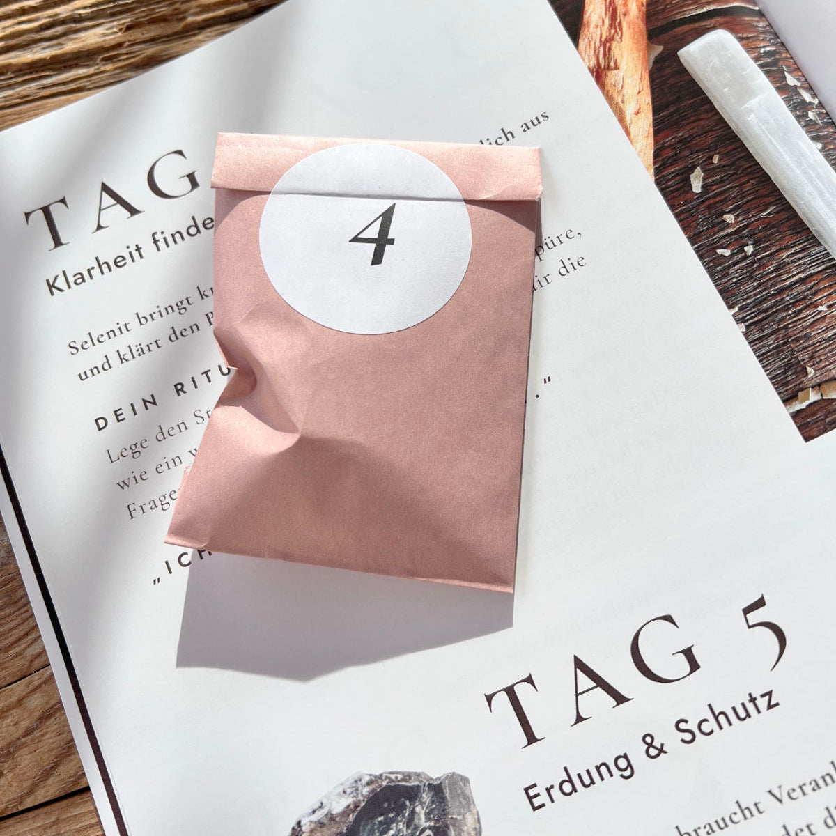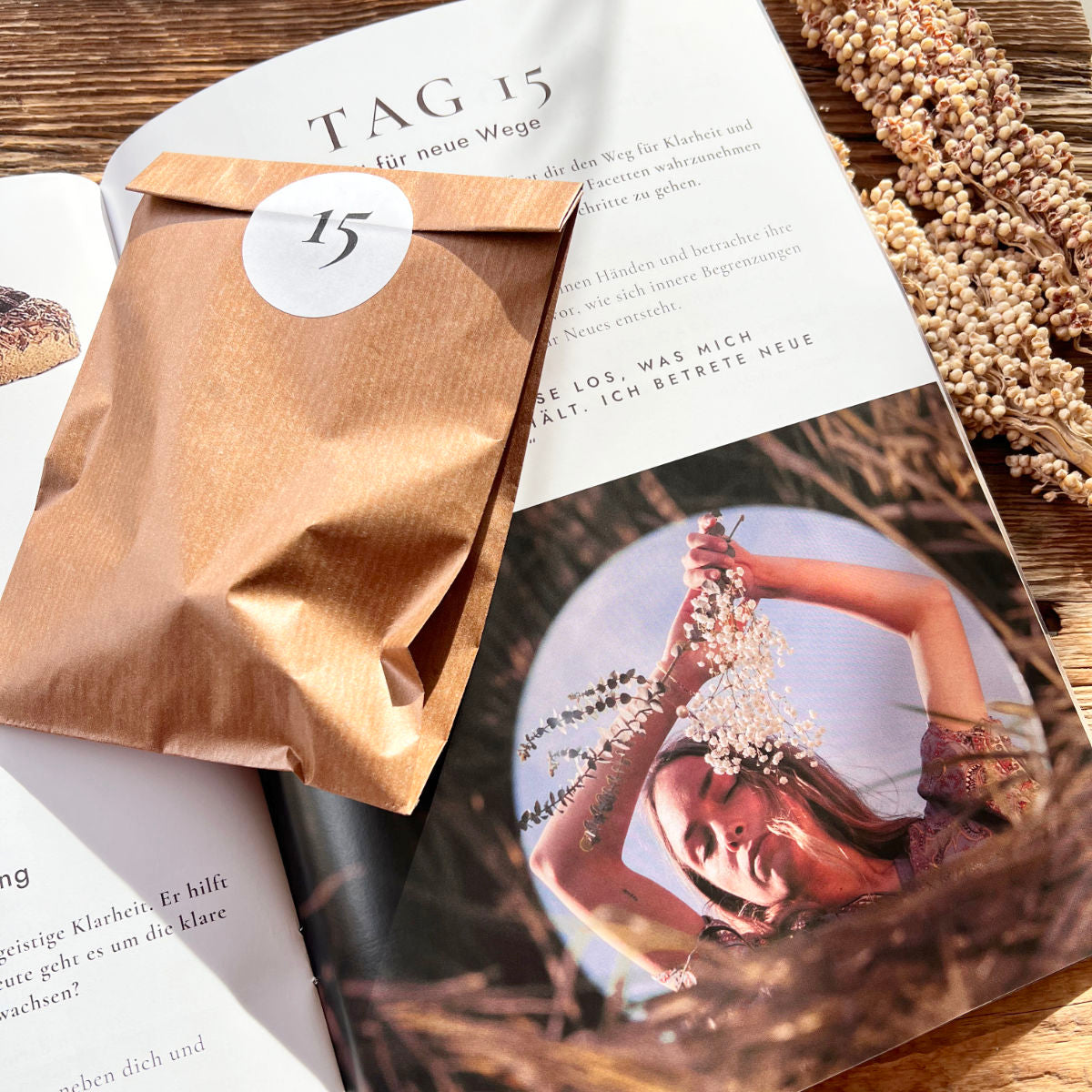 Die 24 Gaben sind in umweltfreundlichen Papiertaschen verpackt, die sich wunderbar als Geschenke an deine Lieben eignen – und auch nach Weihnachten wundervoll deine spirituelle Reise unterstützen. Keine kitschige Weihnachtsoptik, sondern ein zeitloser, moderner Look, der zu deinem spirituellen Lifestyle passt.