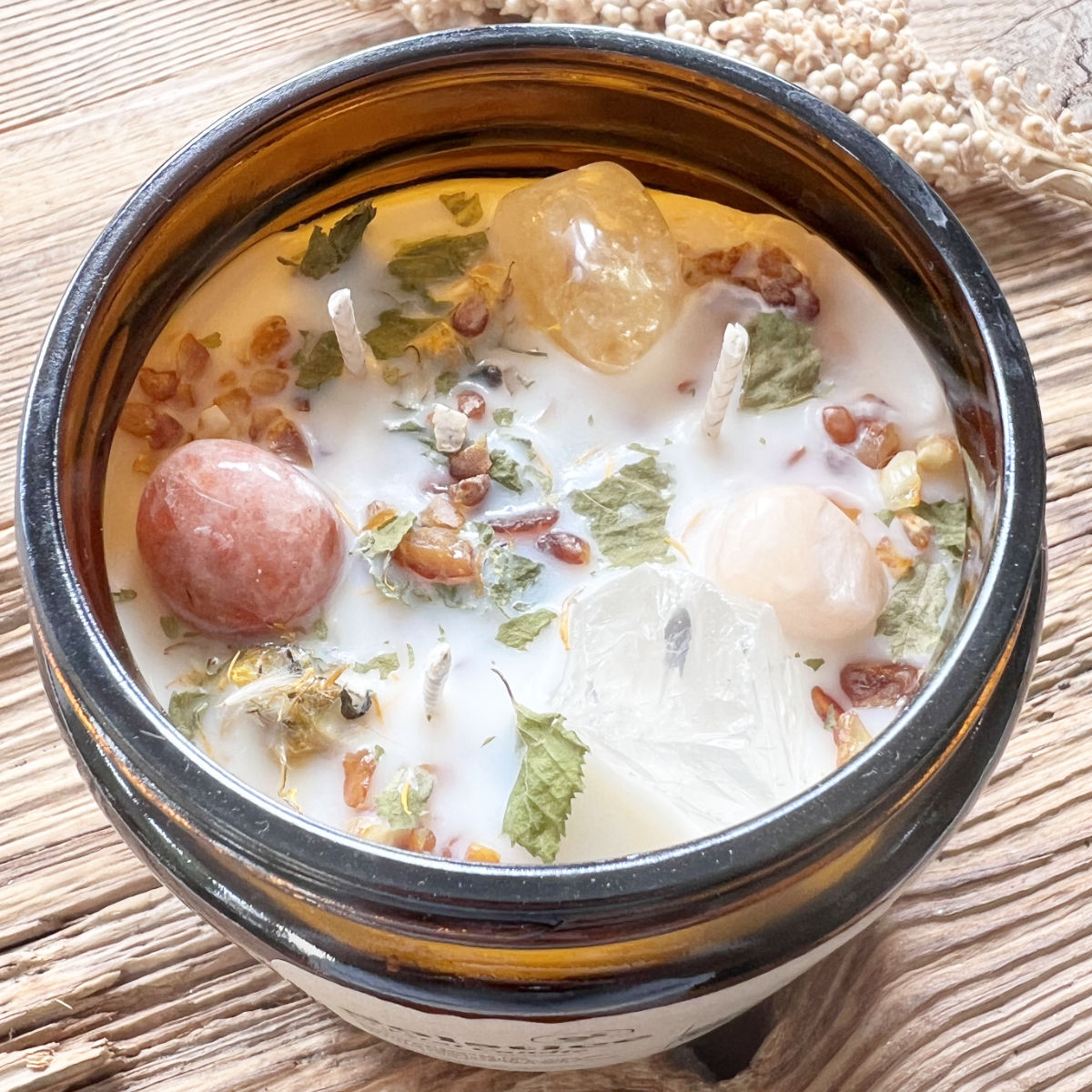 Entdecke die magische Verbindung von Feuer und Erde mit unseren handgefertigten Kristallkerzen. Jede Kerze wird mit Liebe in unserer Manufaktur gegossen, verfeinert mit einer Auswahl an handverlesenen Kristallen, die nicht nur die Sinne berühren, sondern auch das Herz.