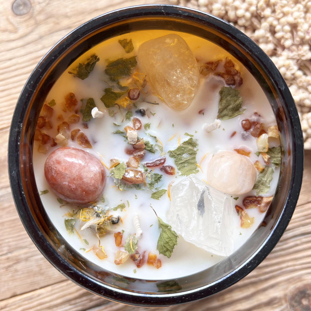 Girasol, Stilbit, Citrin, Sonnenstein und Bernstein verbinden sich mit Ylang-Ylang-Öl, Birkenblättern und getrocknetem Löwenzahn, um dein Zuhause in einen lichtvollen, energetisch klaren Raum zu verwandeln.