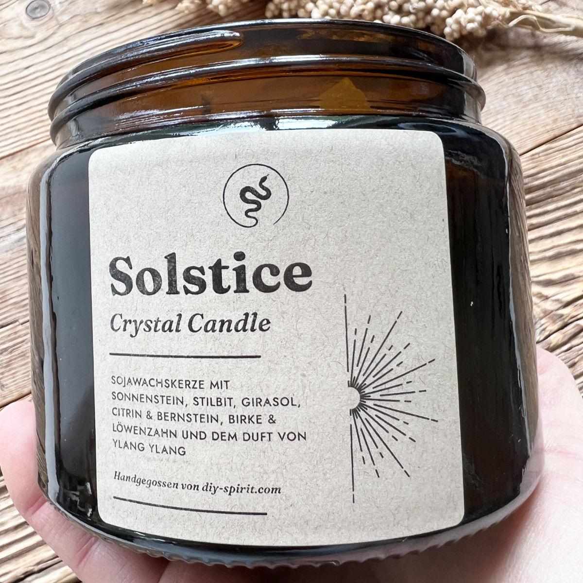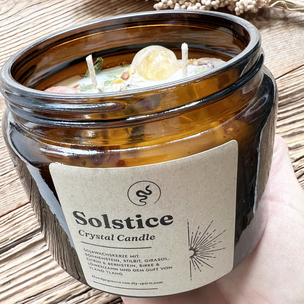 Lass das goldene Licht der Sonnenwende in deinem Zuhause erstrahlen – mit dieser handgegossenen Kristallkerze aus pflanzlichem Sojawachs, reinem Ylang-Ylang-Öl und kraftvollen Heilsteinen für Leichtigkeit, Wärme und inneres Strahlen.